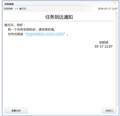任務(wù)創(chuàng)建后系統(tǒng)把任務(wù)到達(dá)通知執(zhí)行人,如果你安裝過AM系統(tǒng),AM系統(tǒng)會在第一時(shí)間給執(zhí)行人發(fā)一個(gè)任務(wù)到達(dá)消息,點(diǎn)開AM消息即可查看任務(wù),并確認(rèn)是否執(zhí)行,具體操作如下: