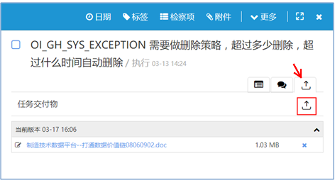 點(diǎn)上圖中的紅色框線區(qū)域的“上傳”按鈕即可選擇文件進(jìn)行上傳,上傳成功后會在任務(wù)交付物 列表中顯示。 如果要?jiǎng)h除交付文件,點(diǎn)擊交付文件后面的“刪除”按鈕。