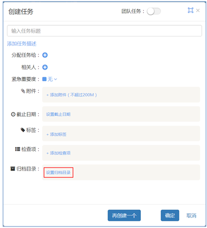 在項(xiàng)目中創(chuàng)建任務(wù),系統(tǒng)彈出的創(chuàng)建任務(wù)彈框會比平常任務(wù)創(chuàng)建彈框多一個(gè)歸檔目錄設(shè)置,如下圖紅色框線區(qū)域所示。