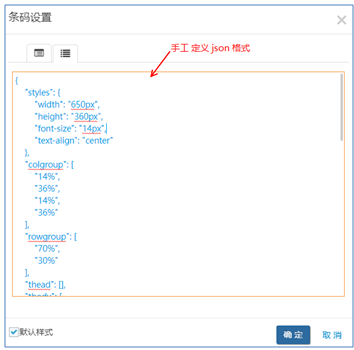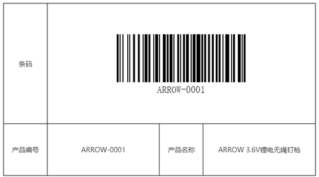 “styles”: { “width”: “650px”, “height”: “360px”, “font-size”: “14px”, “text-align”: “center” }, “colgroup”: [ “14%”, “36%”, “14%”, “36%” ], “rowgroup”: [ “70%”, “30%” ], “thead”: [], “tbody”: [ [ { “type”: “text”, “value”: “條碼” }, { “span”: [ 1, 3 ], “type”: “attr-barcode”, “value”: [ { “type”: “attr”, “value”: “S_GDS_CODE” } ], “compose”: true } ], [ { “type”: “text”, “value”: “產(chǎn)品編號” }, { “type”: “attr”, “value”: “S_GDS_CODE” }, { “type”: “text”, “value”: “產(chǎn)品名稱” }, { “type”: “attr”, “value”: “S_GDS_NAME” } ] ] } |