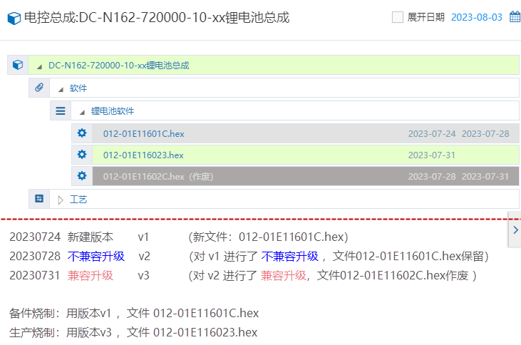 Mobox關于對數據版本的討論 2023/08/03 分類:產品中心 低代碼 實施方案 737 Mobox數據對象,是可以進行版本管控的,關于版本設置 兼容升級: 這個電控軟件 原先的版本被廢棄,直接采用當前新的版本 不兼容升級:這個新版本,只能在當前生產的電控總成里面用,以前的老的電控總成 是不能安裝到這個新電控軟件的;? 以前的電控總成將成為 備件燒制; 效果圖: 我們可以看到 v1 他是有時效性的,有效期到 20230728 標簽:低代碼方案 上一篇: Mobox低代碼(WMS)關于入庫作業流程的思考 下一篇: mogodb數據庫端口外網偵測不到