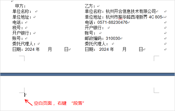 我們在做合同的時候,最后輸入的是甲方,乙方。而甲方乙方的信息很有可能是用表格來輸入的。Word插入表格后默認在表格下方會增加一行。而這一回若放不下會進入下一頁,形成空白頁面。 我通過了很多方法都無法刪除這個一行(就是無法刪除空白頁面)