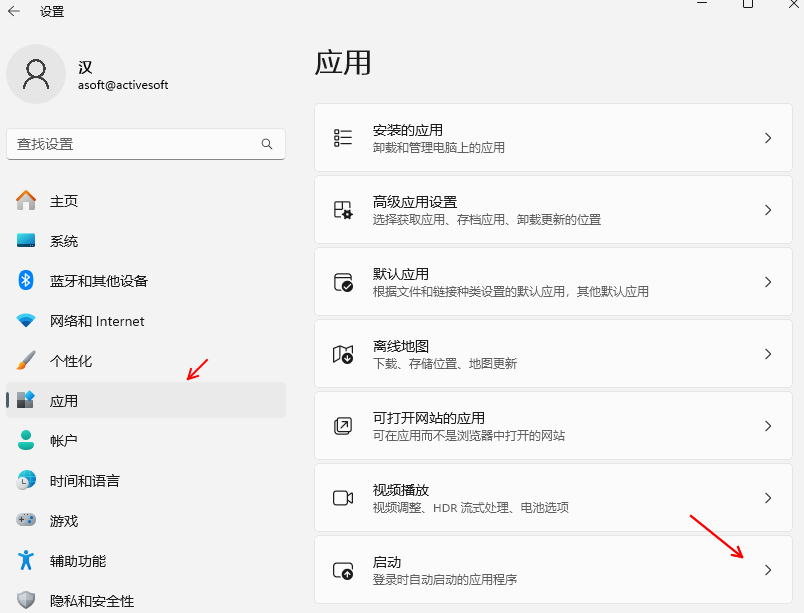 根據(jù)設(shè)置一的步驟,使用同樣的方法,找到“應(yīng)用”和“啟動”選項
