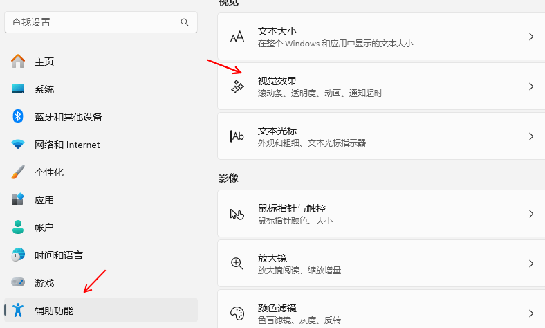 左側(cè)菜單選擇“輔助功能”,右側(cè)選項中找到“視覺效果”,通過關(guān)閉透明效果和動畫效果,你可以減少系統(tǒng)的視覺負(fù)擔(dān),提高電腦的響應(yīng)速度和流暢度。