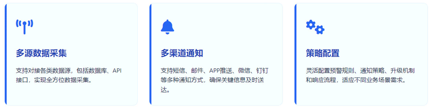 mobox預警管理平臺系統集采集、預警提醒一體,通過按需數據采集(可以企業自己IT人員來維護)、多渠道通知機制,幫助組織及時發現潛在風險,快速響應各類事件,有效降低運營風險,提升管理效率 。系統采用模塊化設計,支持高度定制化,可廣泛應用于金融風控、生產安全、IT運維、環境監測、公共衛生等多個領域,滿足不同行業的預警管理需求。